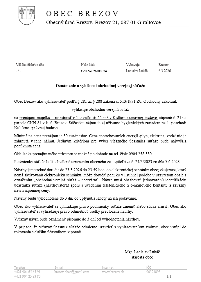 Zverejnené 15.05.2023 o 06:47 Zámer prenájmu nehnuteľného majetku obce Brezov